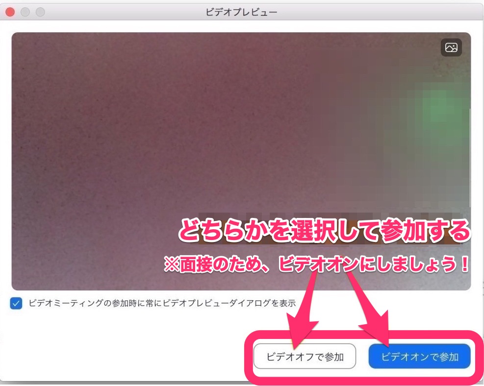 次の画面で、「ビデオオフで参加」/「ビデオオンで参加」のどちらかを選択します。面接ですので、ビデオONで参加しましょう!